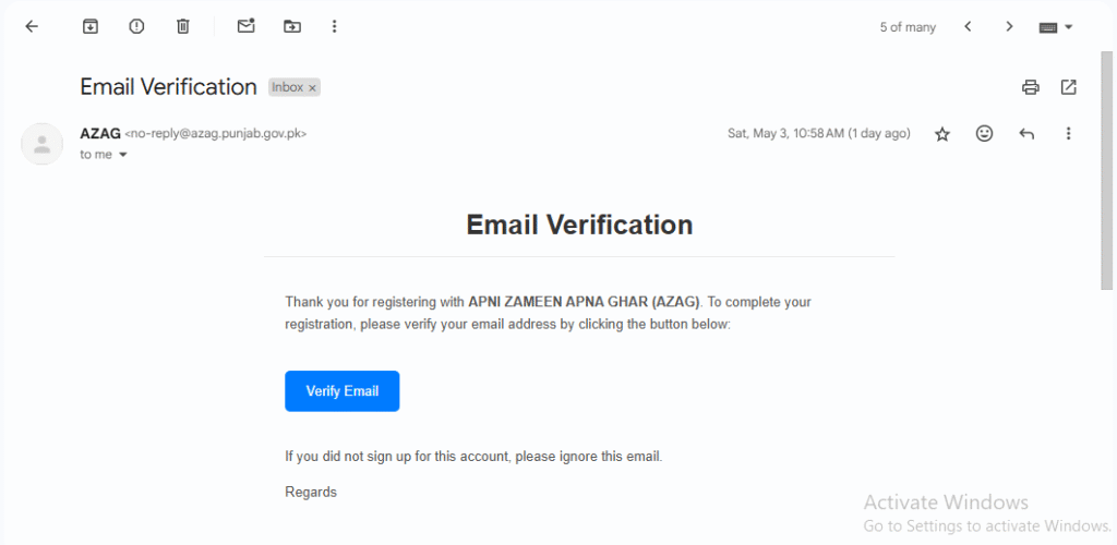 اس مرحلے میں اپ کے پاس ایک ای میل ائے گی جس کو اپ نے ویریفائی کرنا ہوگا رجسٹریشن مکمل کرنے کے لیے ای میل ویریفائی ہونا لازمی ہے یہ اپ کے موبائل فون کے ذریعے ہو سکتی ہے اپ میل باکس میں جائیں گے ویریفائی ای میل کے بٹن پر کلک کریں گے اور اپ کی ای میل ویریفائی ہو جائے گی
