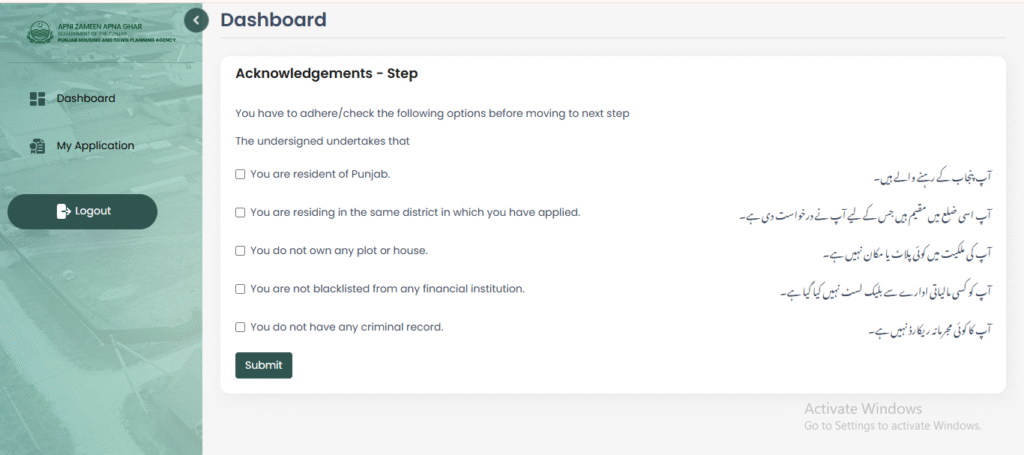 اپنی زمین اپنا گھر پروگرام میں درخواست دینے کا پہلا مرحلہ