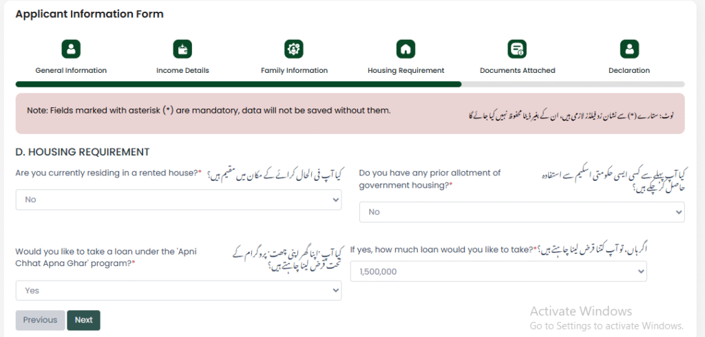 اس مرحلے میں اپ نے لکھنا ہے کہ اپ کرائے کے مکان میں رہ رہے ہیں یا نہیں کیا اپ نے کسی پہلے حکومت پاکستان یا پنجاب حکومت سے جاری کردہ سکیم میں حصہ لیا ہے یا نہیں کیا اپ اپنی چھت اپنا گھر پروگرام کے تحت قرض حاصل کرنا چاہتے ہیں یا نہیں اگر حاصل کرنا چاہتے ہیں تو کتنا قرض حاصل کرنا چاہتے ہیں