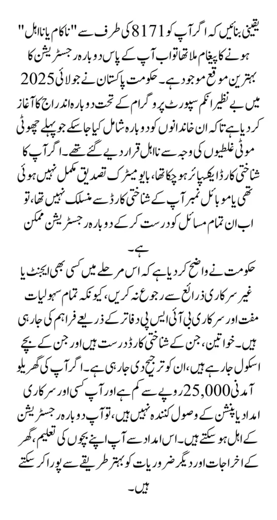 8171 BISP Payment Re-Registration Government of Pakistan has officially launched a new re-registration phase under the BISP in July 2025. This new opportunity is specially designed for individuals and families who previously received an ineligibility message when applying for the Rs. 13,500 financial assistance.