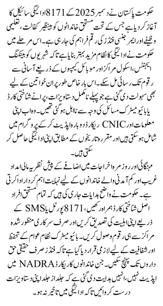 The 8171 December 2025 payment process is now live with strict transparency, biometric security, and multiple distribution channels to assist women and families across the country. Beneficiaries should stay informed, follow official communication, and avoid middlemen. Those who were earlier marked ineligible now have a golden opportunity to re-verify and receive payments again. Updating CNIC and keeping records accurate is essential for long-term eligibility and smooth disbursement in upcoming cycles.