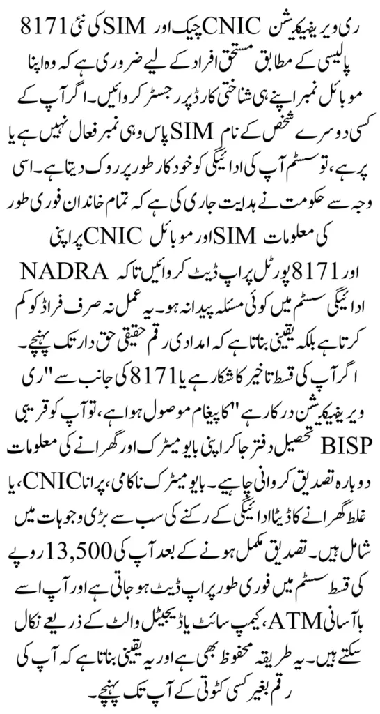 The 8171 SIM check system verifies whether your mobile number is registered under your own CNIC. Since BISP has linked digital wallets and payment notifications with registered mobile numbers, unverified or inactive SIMs immediately cause payment delays.