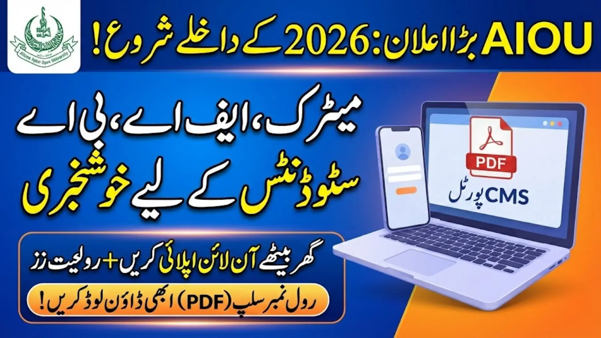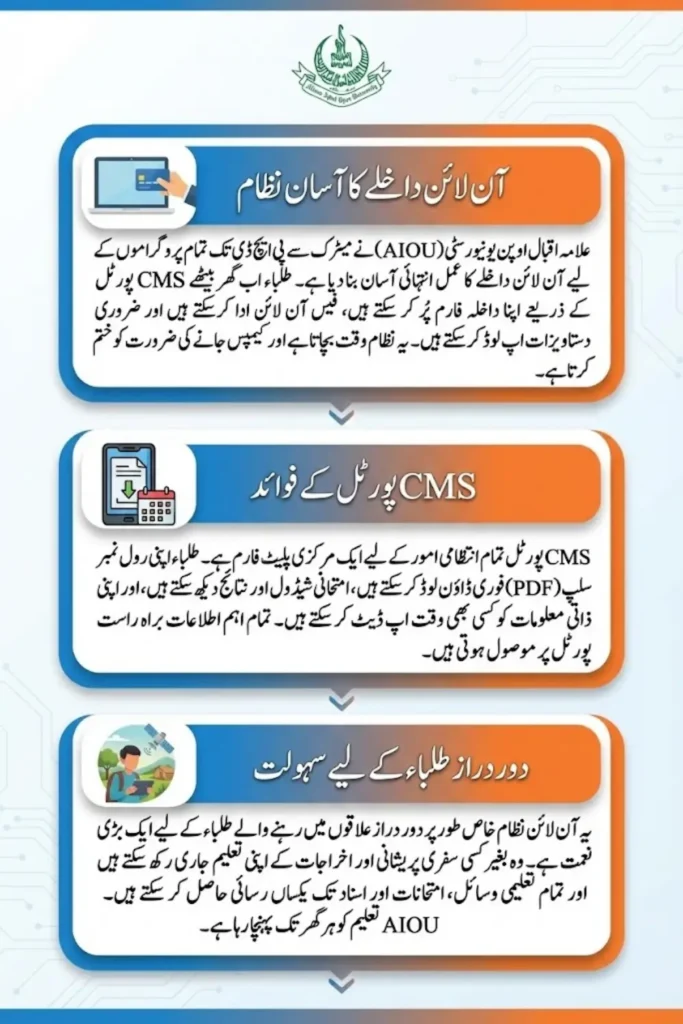 Aiou Enrollment Allama Iqbal Open University AIOU has made it easier than ever for students across Pakistan to enroll in their desired programs and prepare for exams from the comfort of their homes. Whether you are a Matric, FA, BA, ADP, B.Ed, MA, M.Ed, M.Phil, or PhD student, the AIOU online CMS portal allows you to complete your enrollment, pay fees, and download your roll number slip 2026 without physically visiting the university. This system has been designed to save time and provide convenience, especially for students living in remote areas. The 2026 enrollment is now open, and students are advised to follow the official steps carefully to ensure a smooth process.