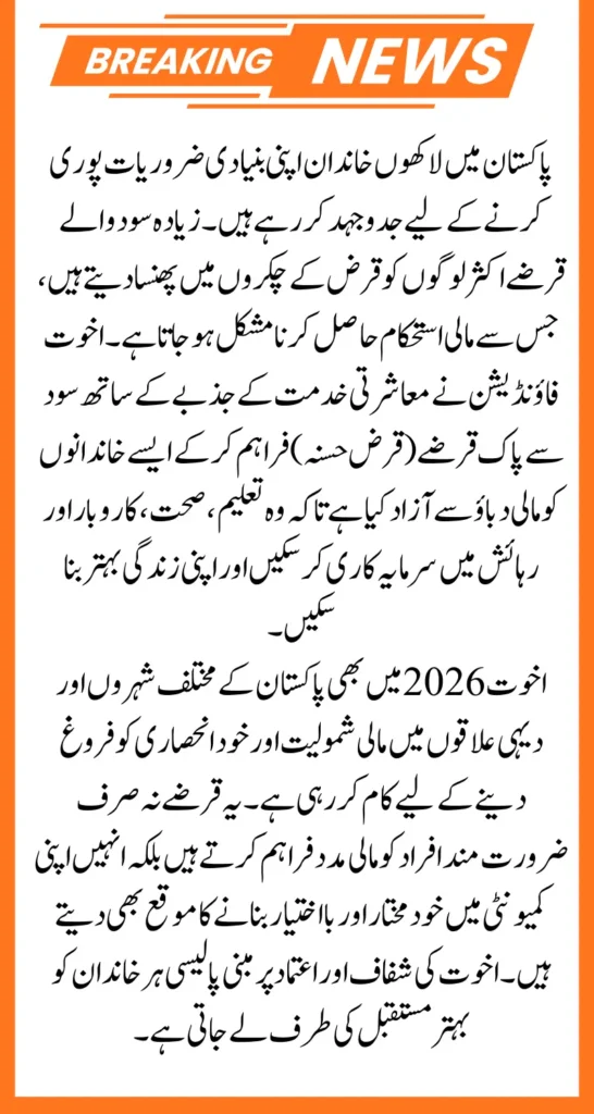 The Akhuwat 2026 Interest-Free Loan Scheme is a practical and reliable solution for Pakistani families seeking financial support. Whether for education, healthcare, housing, or business, Akhuwat loans provide a transparent, interest-free, and easy-to-access option.