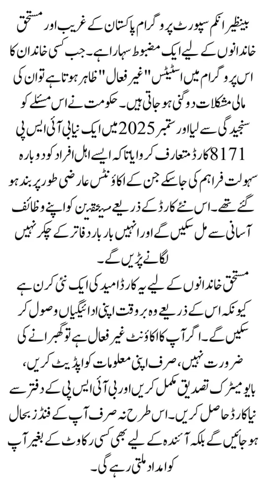The launch of the new BISP 8171 card in September 2025 marks a significant step towards resolving inactive account issues. For eligible beneficiaries who were previously unable to access their stipends, this card provides a pathway to quick reactivation and secure payment collection.