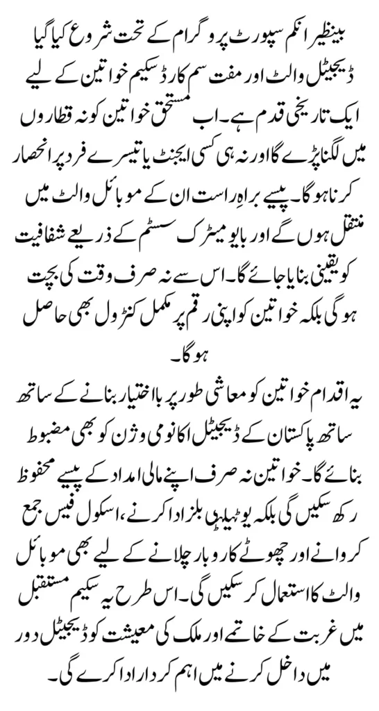 The Digital Wallet Scheme under BISP is designed to directly connect women beneficiaries with mobile-based financial services. Instead of relying on middlemen or traveling long distances to payment centers, eligible women will now receive funds in mobile wallets that are linked with their CNIC and personal SIM cards. Each wallet will be secured with biometric verification, ensuring that only the rightful beneficiary can access the payment.