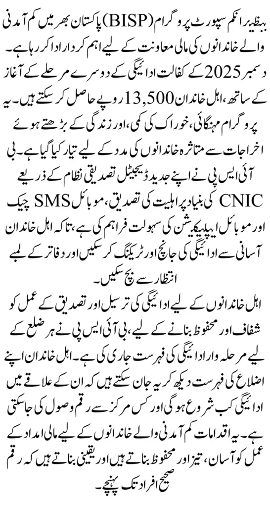 BISP Payment Phase 2 Has Begun continues to play a vital role in supporting low-income families across Pakistan. With Phase 2 of the December 2025 Kafalat Payment now underway, eligible households can receive Rs. 13,500 as part of the government’s quarterly assistance initiative. This program is designed to help families manage rising living costs, food insecurity, and inflation. In addition to providing financial relief, BISP has introduced digital verification systems that make it easier for beneficiaries to confirm their eligibility and track payments without visiting crowded offices.