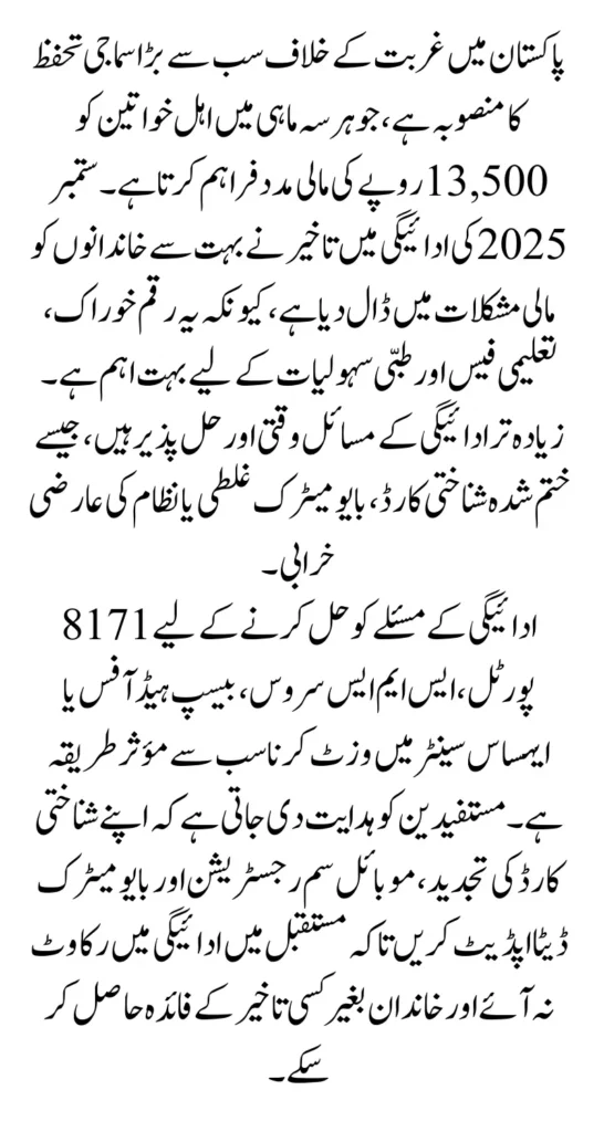 BISP September Payment Issues is one of the most significant social protection initiatives in Pakistan. Millions of low-income families rely on this program to meet essential household needs, including food, education, and healthcare. Every quarter, eligible beneficiaries receive Rs. 13,500, which acts as a vital financial lifeline, especially during periods of rising inflation.