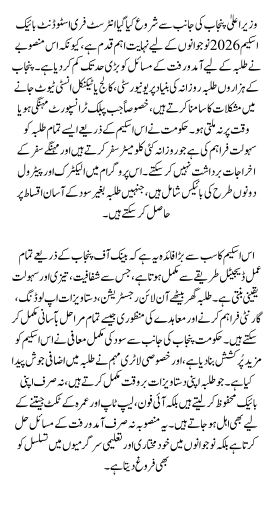 The CM Punjab Interest-Free Student Bike Scheme 2026 is a landmark initiative that aims to empower students by providing convenient and affordable transportation. With a fully digital application system, transparent loan structure, and interest-free installments, the scheme offers long-term benefits for students across Punjab. Whether traveling to educational institutions, internships, or part-time jobs, students can rely on this scheme to improve their daily mobility.