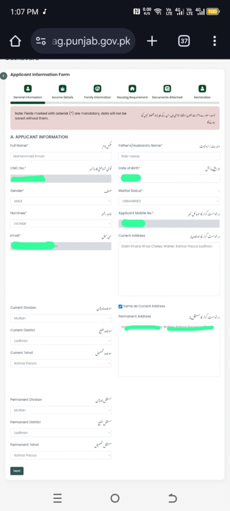 After logging in, access the application form and provide your personal and family details. This includes your full name, CNIC number, marital status, family income, and the district you are applying from. You’ll also need to confirm that you meet all the eligibility conditions mentioned earlier.