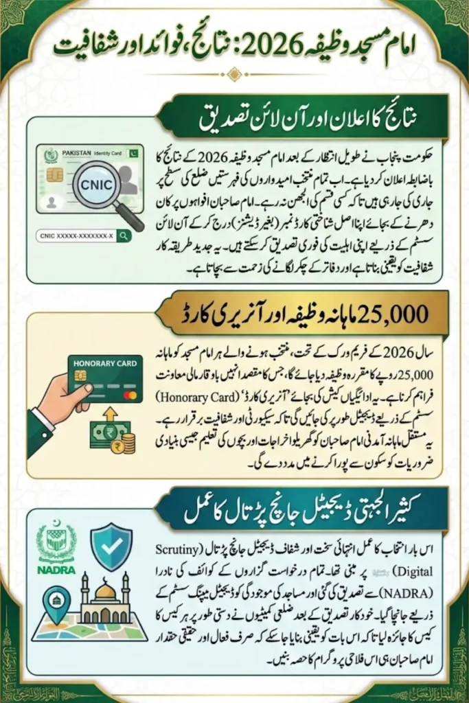 Every approved name in the Imam Masjid Wazifa Results 2026 has passed through a multi-layered digital scrutiny process. CNIC information is cross-checked with NADRA, while mosque records are verified through digital mapping systems to confirm authenticity.