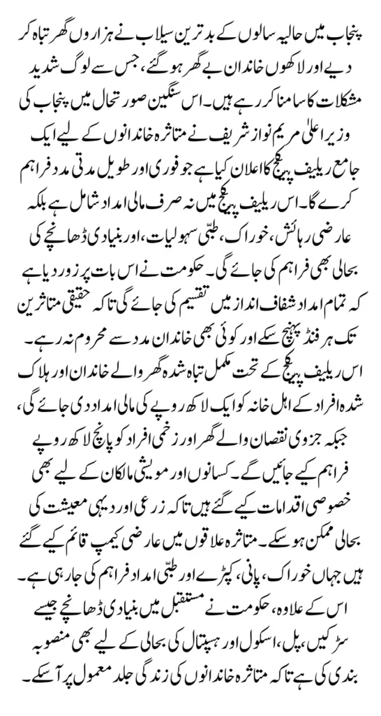Punjab has witnessed one of the worst floods in recent years, which has destroyed thousands of homes, displaced millions, and left families struggling to survive. In this challenging situation, Punjab Chief Minister Maryam Nawaz Sharif has announced a comprehensive flood relief package to provide immediate and long-term support to the victims. The relief plan covers not only financial compensation but also temporary shelter, food, medical facilities, and the restoration of essential infrastructure.