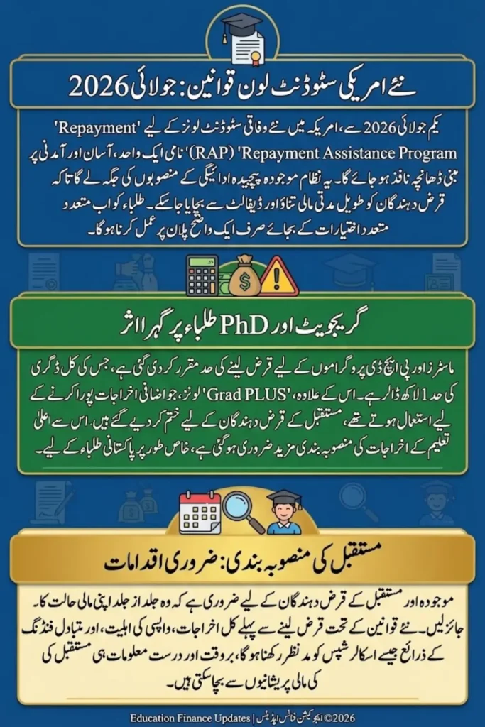 New Federal Rules Reshape Student Loan Repayments From July 1, 2026, the United States is set to introduce major changes to its federal student loan repayment system. These changes will affect millions of borrowers, including international students and Pakistani families who send their children abroad for higher education. Over the years, student loans have become a heavy burden, especially for graduate and doctoral students who spend many years studying before earning a stable income. The new rules aim to simplify repayment, reduce confusion, and prevent borrowers from falling into long-term financial stress.