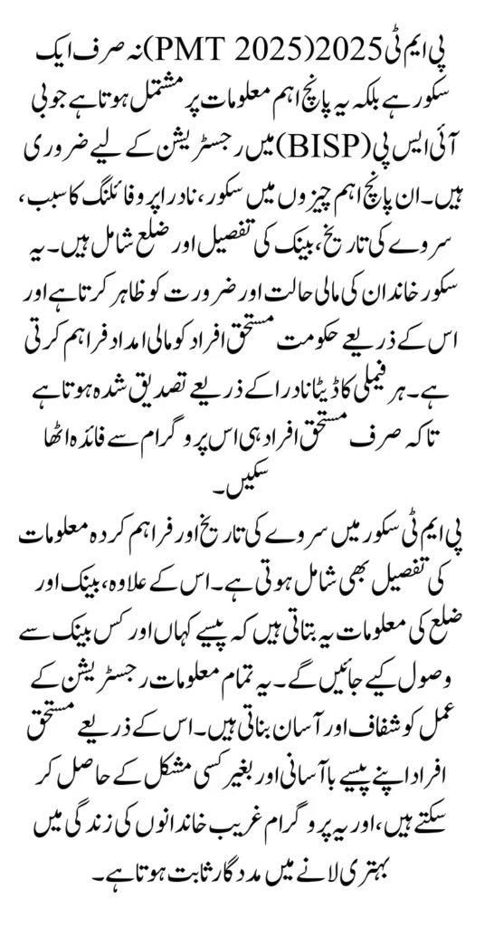 PMT 2025 Complete Guide Score is a critical system used by the Benazir Income Support Programme (BISP) to determine which households are eligible for financial support. Many people think the PMT is just a score, but it is much more comprehensive. It includes five essential elements: the PMT score, NADRA profiling reason, survey date, bank information, and district details. Each of these components plays a vital role in ensuring accurate and fair distribution of BISP assistance.