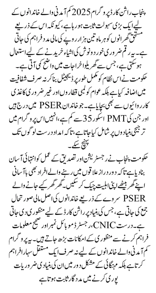 The Punjab Ration Card Program 2025 is a major step toward ensuring food security and financial stability for families living under economic stress. With its transparent, digital system and monthly PKR 3,000 assistance, the program provides durable relief to households that need it most.