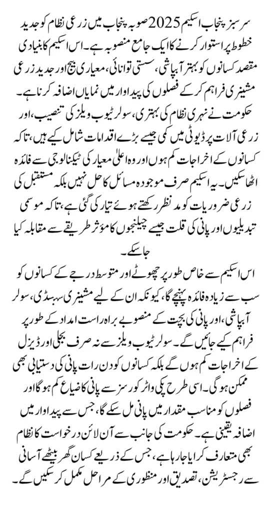 Sarsabz Punjab Scheme 2025 Details is one of the largest agricultural development initiatives launched by the Government of Punjab to reshape the future of farming in the province. Agriculture has remained the backbone of Punjab’s economy, yet farmers have struggled with outdated canals, high irrigation costs, limited access to modern machinery, and declining crop yields. In response to these continuous challenges, the government created a comprehensive, multi-sector programme designed to modernize irrigation, encourage mechanization, reduce input costs, and introduce renewable energy solutions that create long-term stability for the farming community. This scheme is built around climate-smart agriculture, which means it focuses on solutions that not only increase productivity but also prepare farmers to face climate change, water shortages, and rising energy prices.